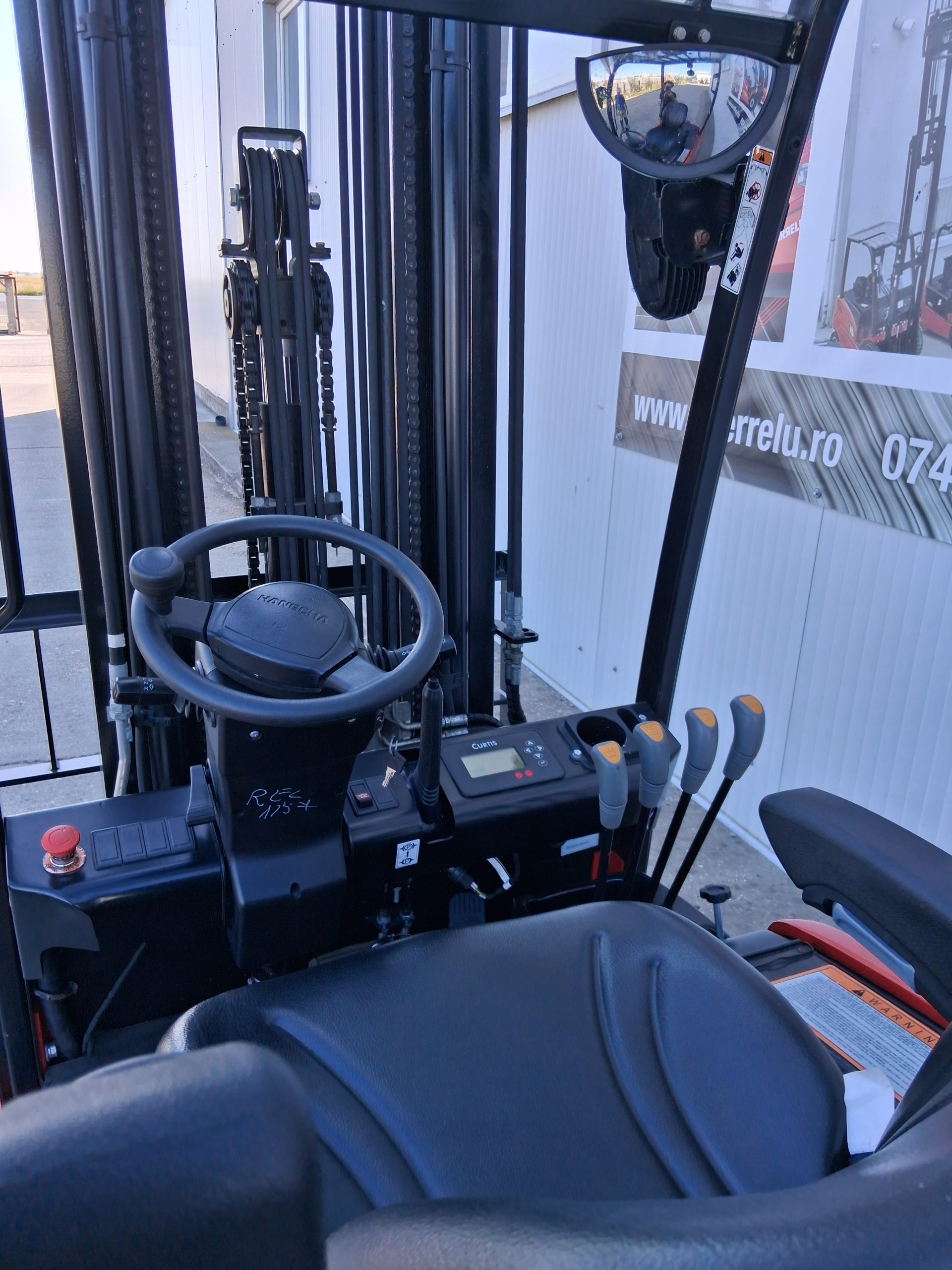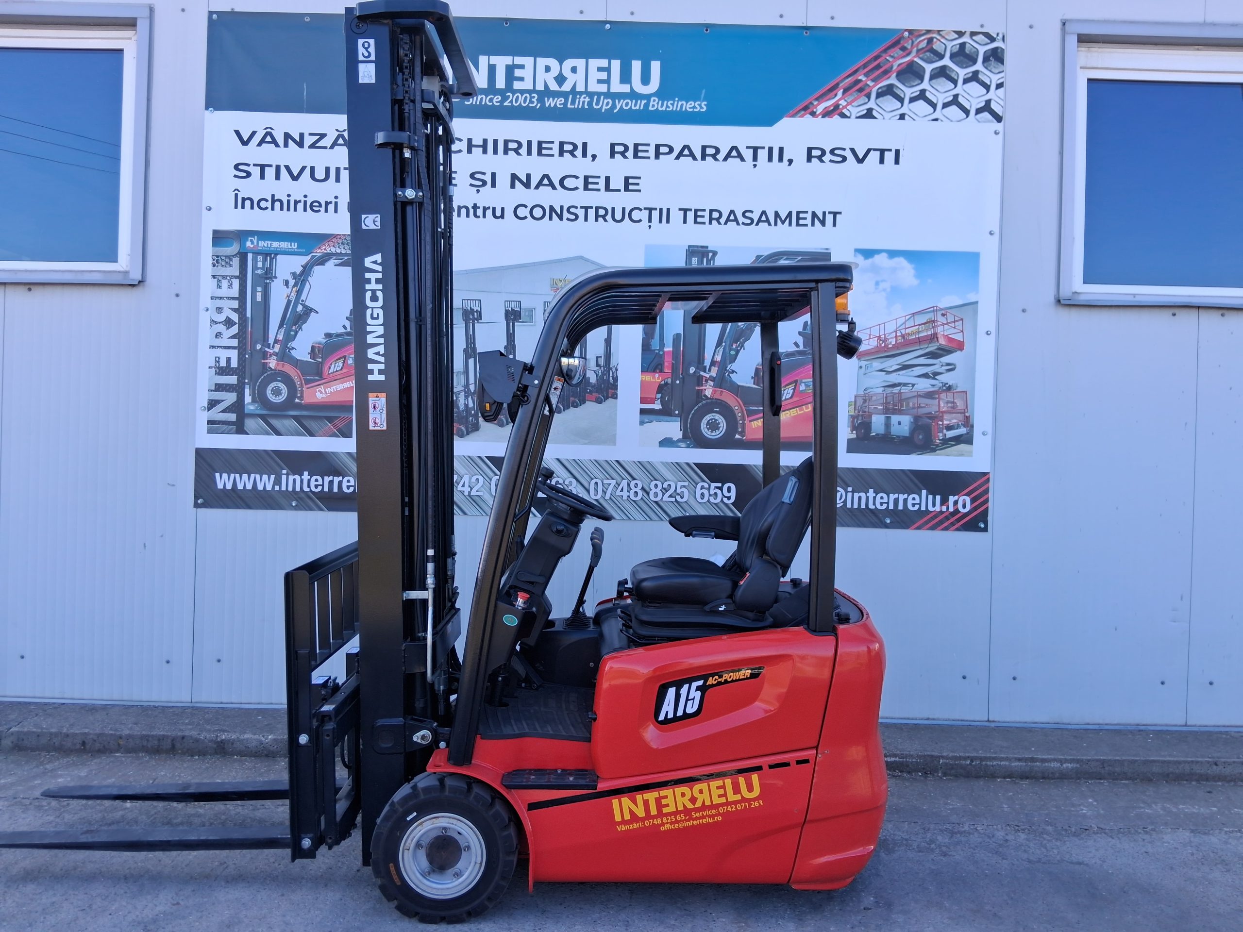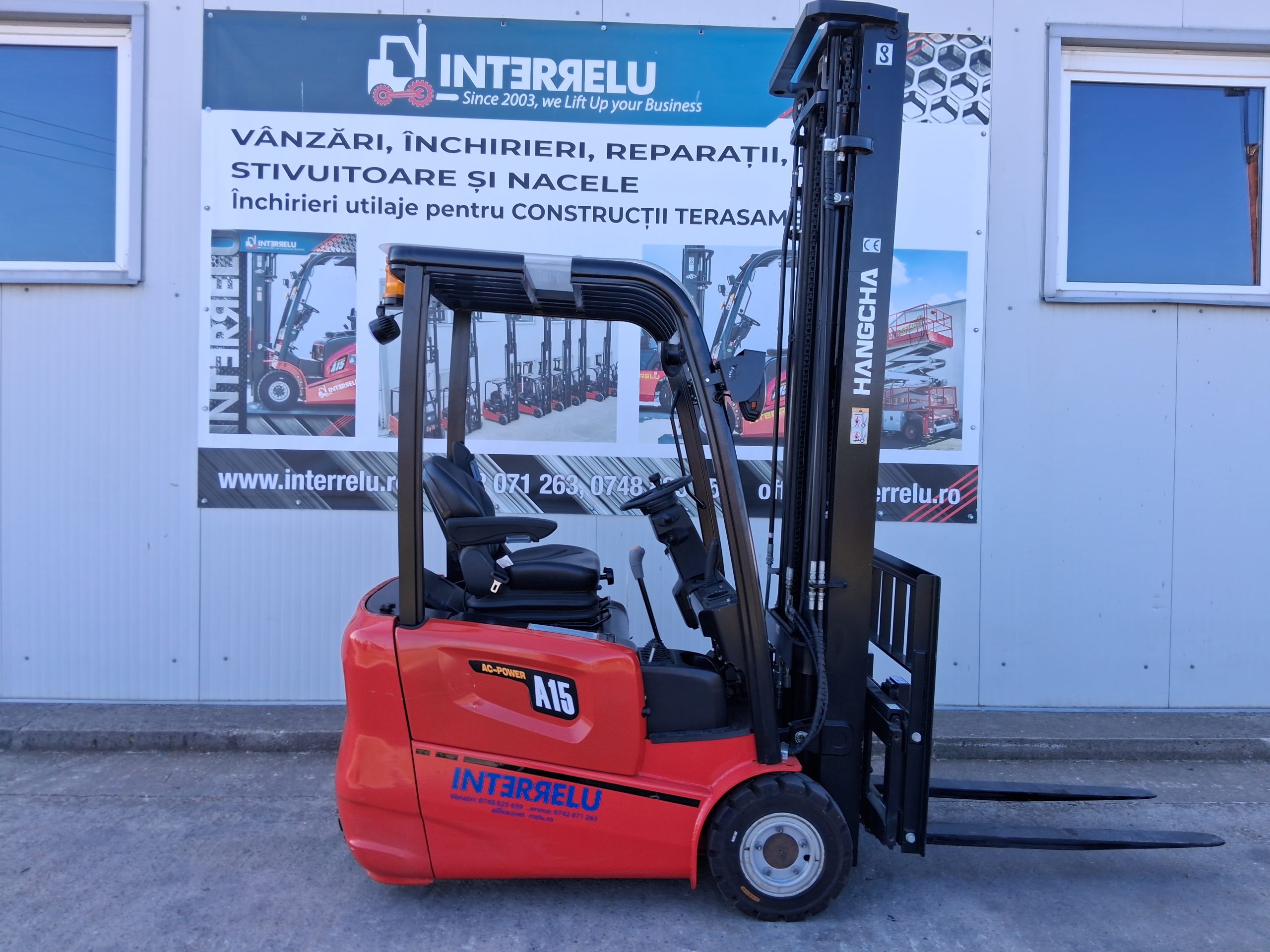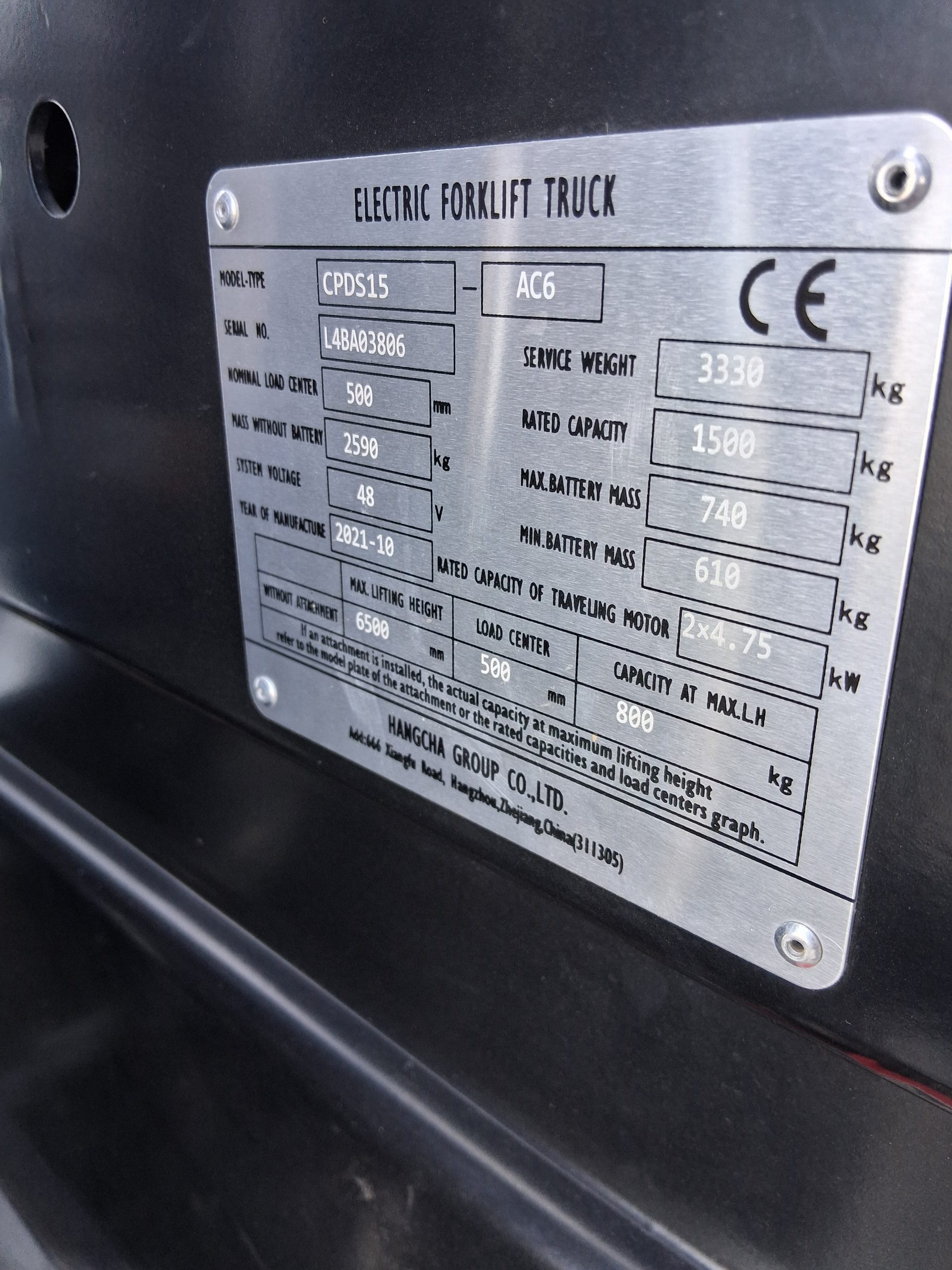 Electrostivuitor Hangcha CPDS15-AC6, L4BA03806/2021, sarcina de ridicare 1500kg, catarg triplex 6500mm, translatie laterala a fucilor, baterie plumb acid, redresor 48v-80 ah, disponibil vanzare-inchiriere..