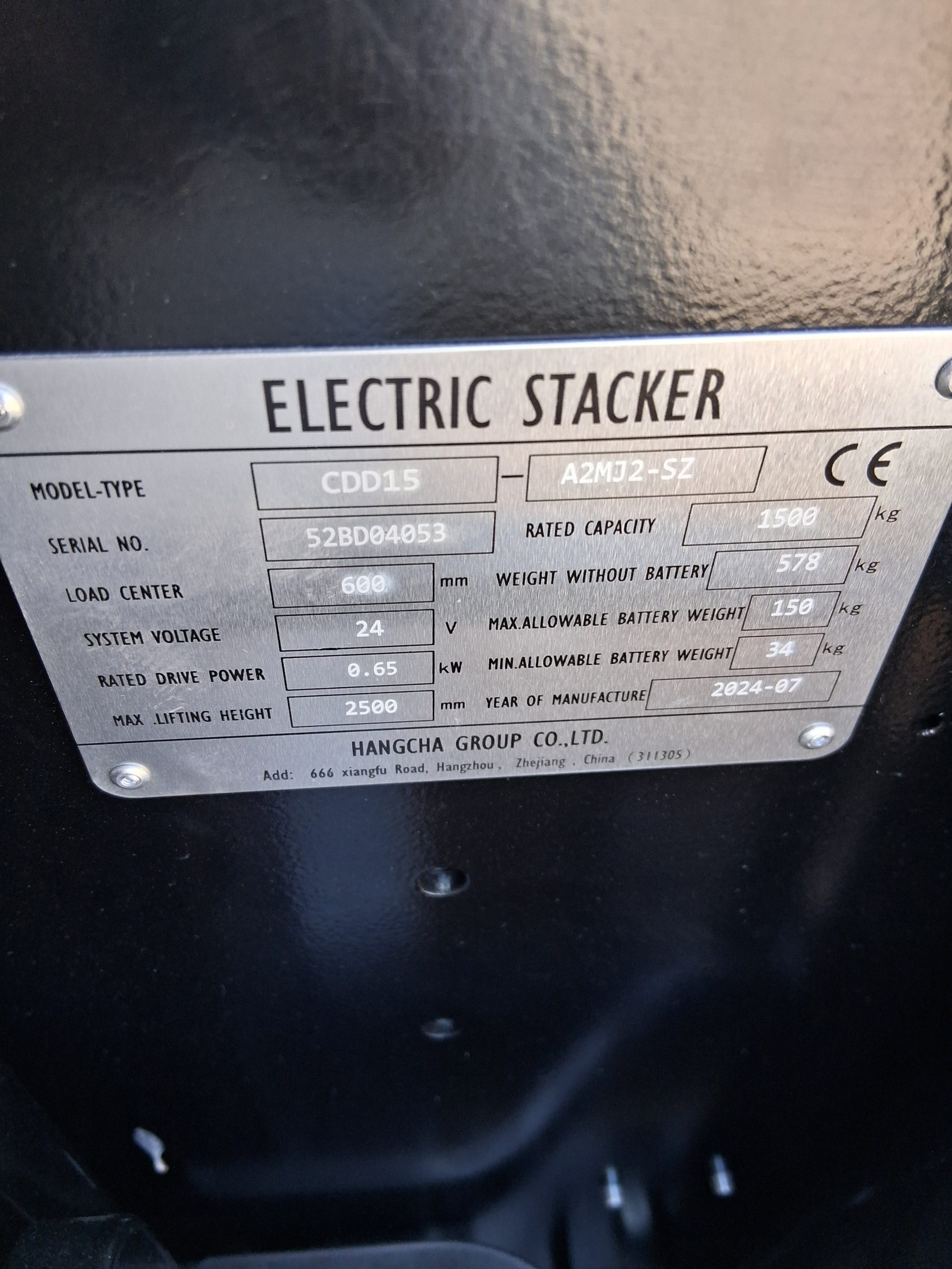 Transpaleta Electrica Hangcha CDD15-A2MJ2- SZ, catarg duplex, inaltime de ridicare 2500 mm, inaltime catarg coborat 1850 mm, sarcina de ridicare 1500 kg, baterie plumb acid.